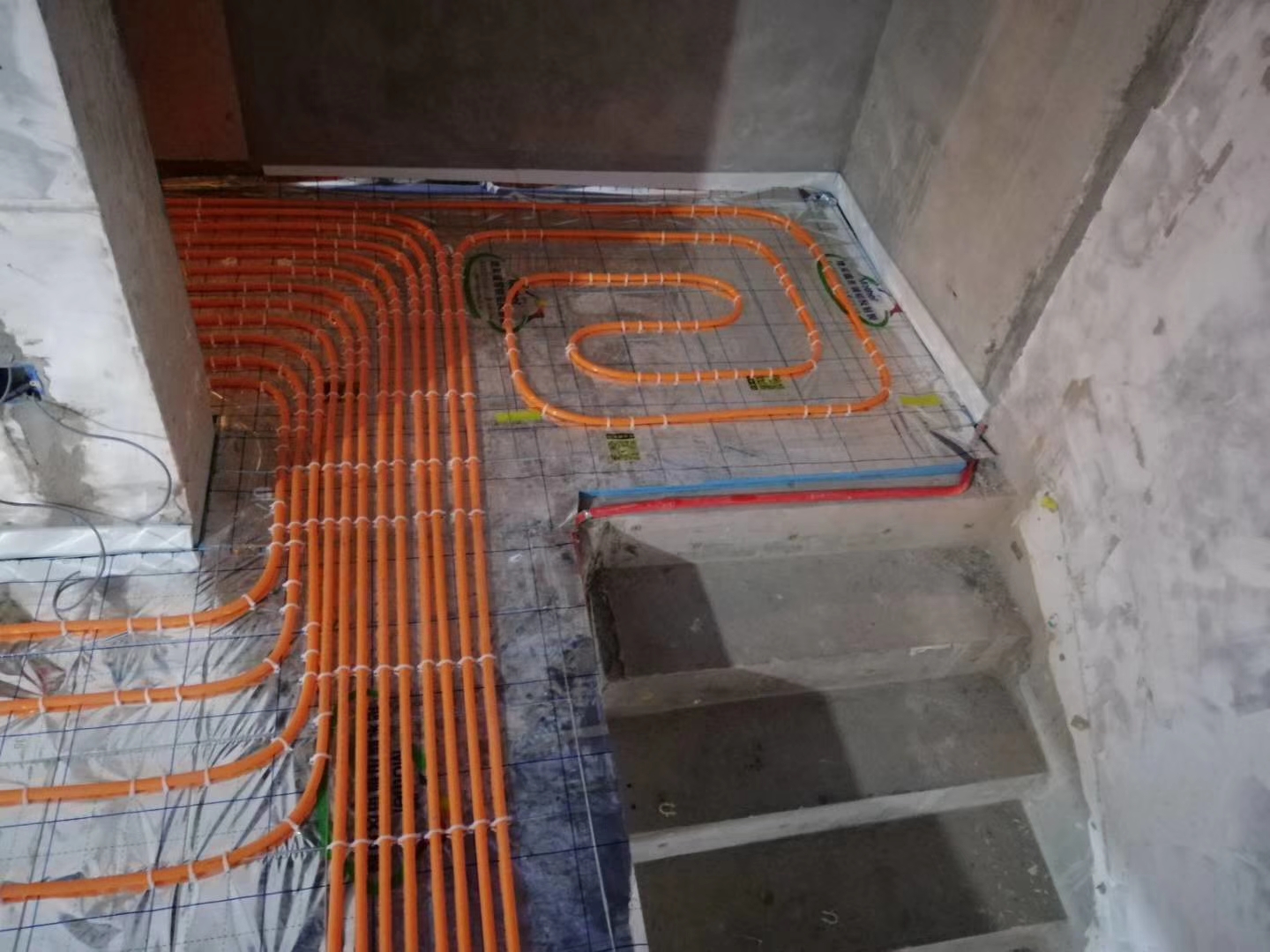 第一步是鋪設保溫板和反射膜。在我們把地面清理干凈以后,首先在原有地面上鋪我們選擇的擠塑板,擠塑板一定要鋪得平整嚴密,然后用膠帶進行固定。在擠塑板的上面開始鋪反射膜,反射膜要鋪嚴,反正膜交接的地方同樣也要使用膠帶進行固定。第二步是鋪底層鋼筋網片。鋼筋網片的規格一般是10mm×10mm,鋼筋網片所使用鋼筋的直徑一般是3mm。鋪設鋼筋網片的目的也就是為了固定我們的地盤管,防止位移以及澆筑混凝土時出現的管道的上浮等情況。第三步是鋪地采暖的地盤管道。地采暖的地盤管道就是地采暖的地盤管的安裝,具體安裝的時候是從分集水器開始,按照我們的設計要求鋪設每個房間的地采暖管道。這里要求的是管道之間的間距要符合要求,另外每個回路的長度要大概一致。此外單個的長度盡量要控制在100米以內。最后使用扎帶把地才能管道與鋼筋網片進行固定。第四步是鋪設上層鋼筋網片。在地采暖管道鋪設完成以后,我們需要在地采暖管道的上層再鋪設一層鋼筋網片。鋪設這層鋼筋網片的作用是防止我們的后澆層出現開裂。在鋪設完上層鋼筋網片以后,一定要把上下層鋼筋片使用扎帶進行固定牢固。第五步是澆筑回填層的混凝土;靥顡嗡滥恋暮穸纫话銇碚f都是60mm左右,混凝土的強度一般都是C20的豆石混凝土。在澆筑的時候一定要注意防止地采暖管道出現位移和上浮的情況。澆筑完成以后要及時養護,以防止造成地面的開裂。
