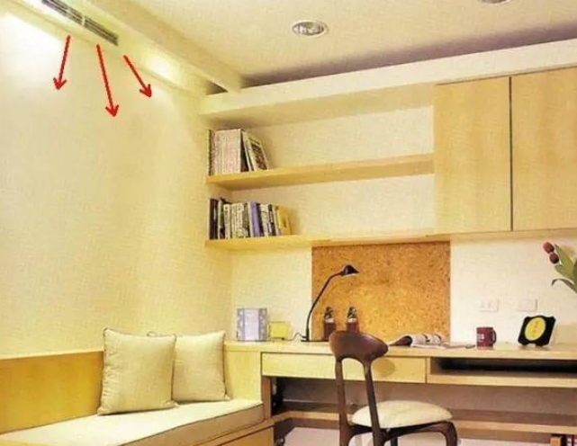 書房是安靜讀書學習的地方,空調(diào)安裝在正面直接吹在桌子上容易造成書或紙張被吹亂,而且迎面的熱風也容易造成人頭暈等過熱的感覺。