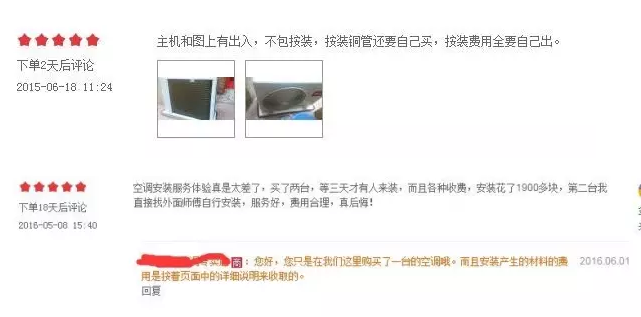 同時,消費(fèi)者對于網(wǎng)購家用中央空調(diào)的反饋意見也比家用空調(diào)多,雖然大部分網(wǎng)友表示滿意,但細(xì)看留言也不乏質(zhì)疑之聲。例如,有消費(fèi)者反映到貨產(chǎn)品有瑕疵,或安裝工人態(tài)度不好,更多的則是對安裝收費(fèi)額度的驚愕,比消費(fèi)者預(yù)想的要高。除了抱怨,我們也能從留言看出網(wǎng)購家用中央空調(diào)安裝上的諸多現(xiàn)狀,很多消費(fèi)者都感嘆家用中央空調(diào)的安裝比自己想象中復(fù)雜。